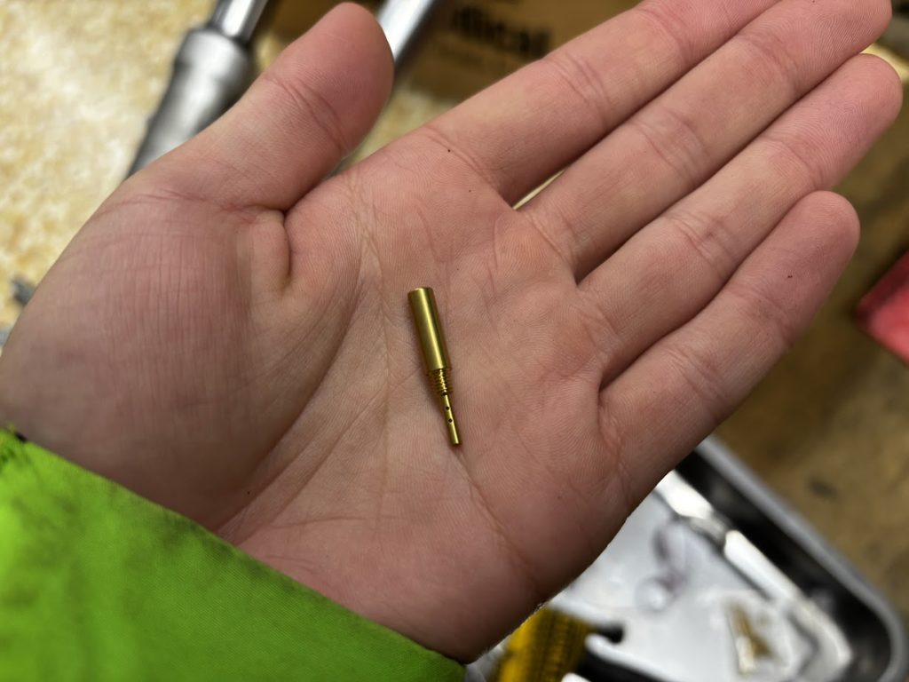 最後に「キュッ」と止まるところでストップしてください。絶対に強く締め込まないでください! 先端の針のような部分が潰れると、キャブレターごと交換になります。優しく、優しく締めます。